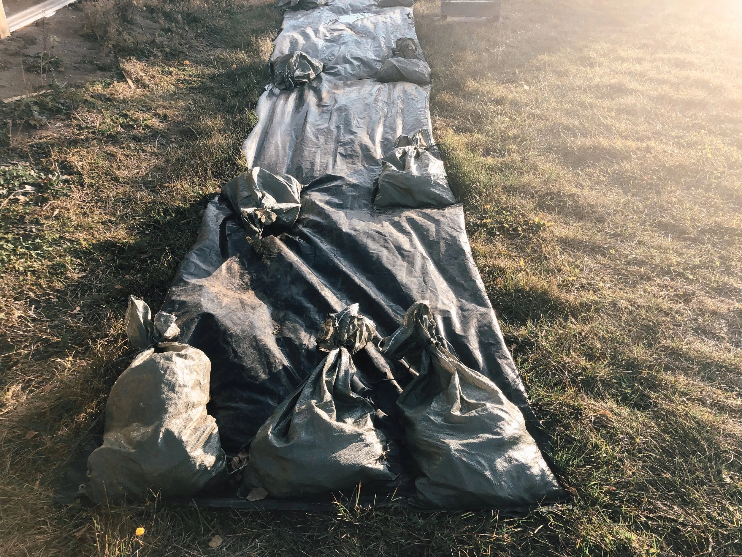· On utilise des toiles à ensilage comme le font les producteurs laitiers. Tu peux aussi récupérer plein de grands sacs en plastique opaque, les couper et les superposer sur toute ta bande de pelouse. Ajoute du ‘’tucktape’’, le ruban adhésif rouge de construction, pour les faire tenir ensemble.